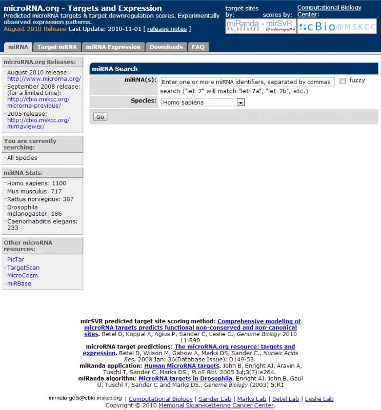 有没有那个前辈用过miRanda数据库预测过斑马鱼的microRNA的靶标?我在那里面压根就没有看到斑马鱼这个物种啊!可是很多帖子都说是可以的,还有权威科学网博主的博文!请高手指点。 microRNA.org.jpg |