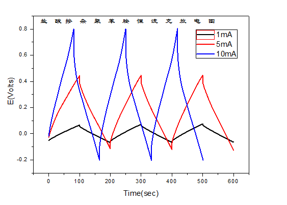 大家好,本人用盐酸掺杂、过硫酸铵氧化合成聚苯胺,然后在综合电力通道进行恒流充放电测试,设定的电压区间为-0.2~0.8.电流分别为1mv,5mv,10mv。但是出现的图的电压区间却不是自己设定的那个,不同电流密度下,图的高度不一致?请问这种情况是什么原因呢?附上图一张。,请问这是为什么呢?感激大家了。