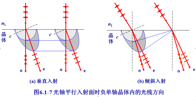 一直以为 nsinθ=ne(θ)sinθ‘, 如果入射角θ=0°(垂直界面入射),无论光轴方向怎样,o光 e 光都应该是继续垂直方向。 可是下图的左图(来自某网上下载的讲义),我不明白呢? 1.PNG |