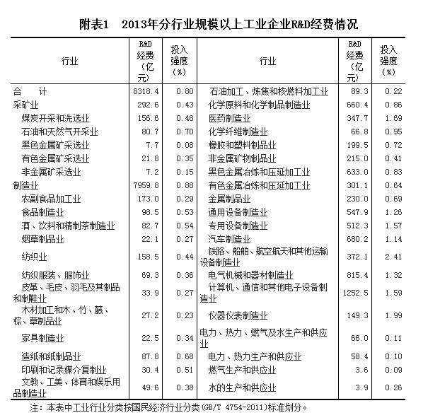 分产业部门[2]看,研究与试验发展(R&D)经费超过500亿元的行业大类有7个,这7个行业经费占全部规模以上工业企业研究与试验发展的比重为61.3%;研发经费在100亿元以上且投入强度(与主营业务收入之比)超过了规上工业企业平均水平的有10个行业(分行业情况详见附表1)。
