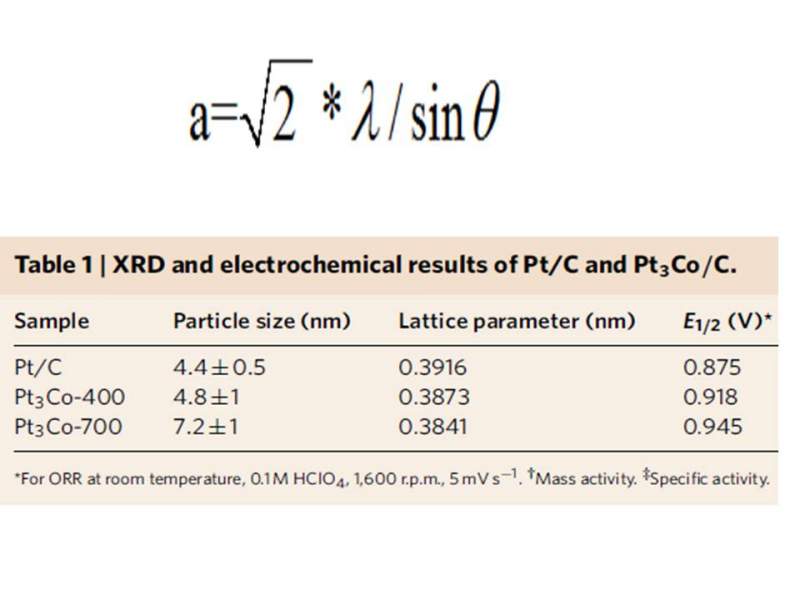 Nature Materials 12, 81–87 (2013) doi:10.1038/nmat3458 The lattice parameter, calculated from the (220) diffraction peak position, and the average particle size, calculated using the full-width at half-maximum of the (220) diffraction and the Debye–Scherrer equation, are presented in Table 1. 公式怎么来的? |