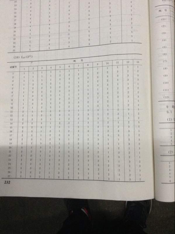 网上找了一个9因素8水平的正交表,希望对你有参考作用。 9因素8水平的正交表 http://wenku.baidu.com/link?url= ... T3ZgC5mZgsJwLjAZ7_u |