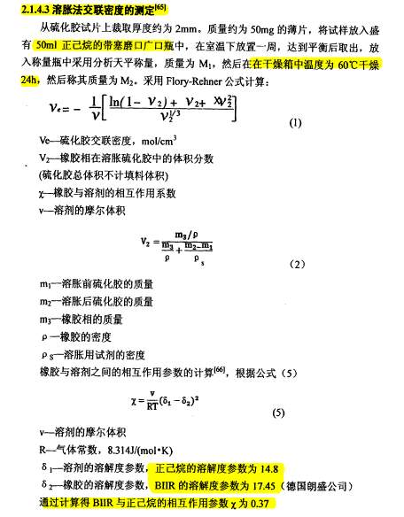 求助:溴化丁基橡胶与甲苯或二甲苯的相互作用参数怎么计算?或从哪可以查到? 我想计算橡胶的交联密度,用的溶胀法,公式中用到聚合物与溶剂之间的相互作用参数,溶剂用的甲苯或二甲苯,这个作用参数一般可以根据经验公式计算得到,但是没找到(溴化/氯化)丁基橡胶的,跪求相助! |