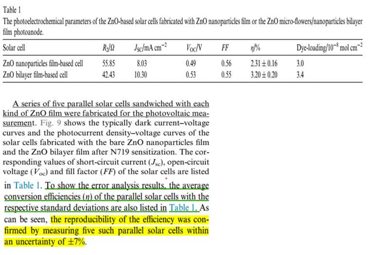 刚才发的帖子里图片太小,怕看不清,再发一次,见谅哈![]() 求解释这段话里面是说测试了五块相同电池得到的误差分析,图里面的±0.16和±0.20是指五块电池的效率的标准差吗? 还有最后一句的reproducibility说效率的重复性是指一块电池测多次得到±7%uncertainty吗? 未标题-1.jpg |