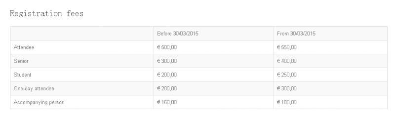 与会者,高级会员,学生,出席一天人员以及随同人员的费用分别是表格第二列和第三列的费用