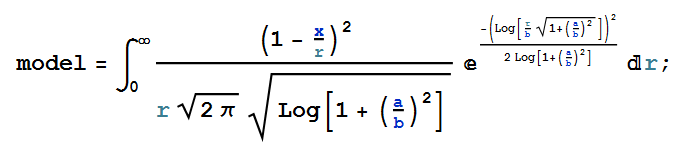 model = Integrate[(1 - x/r)^2*Exp[-(Log[r/b*Sqrt[1 + (a*a)/(b*b)]])^2/(2 Log[1 + (a*a)/(b*b)])]/(r*Sqrt[2*Pi*Log[1 + (a*a)/(b*b)]]), {r,0, Infinity}];