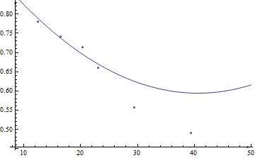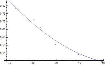 data = {{8.5, 0.828}, {12.5, 0.78}, {16.5, 0.741}, {20.4, 0.714}, {23.1, 0.66}, {29.4, 0.558}, {39.4, 0.491}, {49.4, 0.454}};