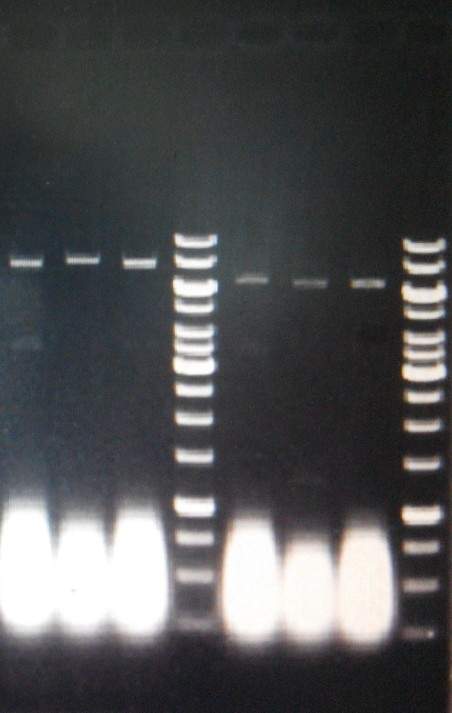 我最近也遇到了相同的情况,用两种不同的单酶切可以切开,但双切时总是出现一条带,很郁闷的···还有就是你的胶最下边那是什么啊,白的一大片,没有跑好吧···