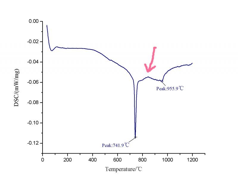 材料是20MnSiV 1、请问一下图中箭头所指的地方是否为放热峰? 2、第一个峰741.9度是不是基体向奥氏体转变的开始温度,第二个峰955.9度是不是基体转变完成温度? 3、若第二个峰是转变完成温度,那么这种材料的奥氏体区是不是太靠上啦(因为一般的低碳钢在912度以下就已经全部完成基体向奥氏体的转变了)?? |