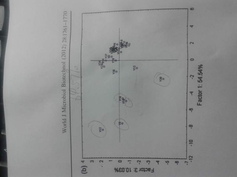 这两天在看一篇外文文献关于菌株主成分分析的,他先做了一个主成分的投影图,说明各成分之间的关系,然后做了各个菌株序号的散点图,找出菌株,我想问一下这两个图是怎么做的,最为重要的是在主成分分析中,我只是对菌株的一些测定特性进行了分析,为什么最后是对对菌株序号进行散点图呢,实在不知道是怎么做的,请告诉我,谢谢另附两张图 20141028_163941.jpg 20141028_163946.jpg |