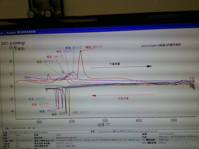 各位,大侠,本人作了一个KNO3和NaNO3的混合熔盐的DSC测试,从50到550,循环测试,一共5次,升温和降温都是20kpermin,结果如图,为什么每经过一个循环,峰值温度都下降了十几度? 103_7_28_186.jpg |