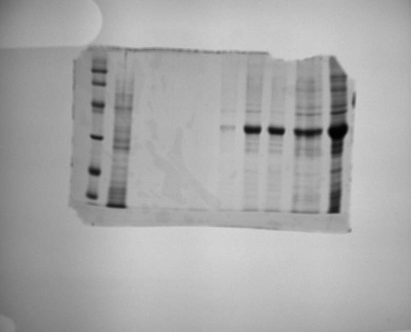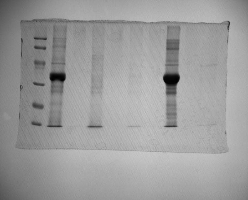蛋白纯化交流擂台,秀出你的蛋白纯化或包涵体提取后的SDS-PAGE图,看看大家的都能纯化到什么地步。小弟不才,班门弄斧,先抛块砖,大家有玉的砸玉,有金砖的砸金砖。 2014.10.18.jpg M,缓,5,10,20,50,100,200,盐酸胍,原液.jpg CYD浓缩后:M,原,浓缩管水洗液,缓,缓洗,25,25水洗,100,100水洗,胍2 (1).jpg |