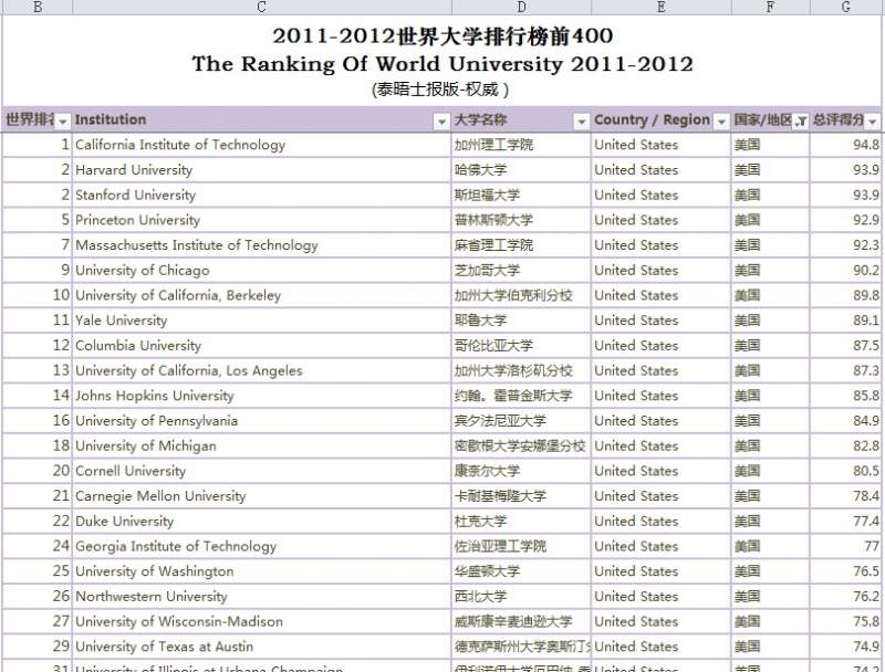 泰晤士报权威的2012年世界大学排行榜前400Excel文件,按国家做了筛选功能