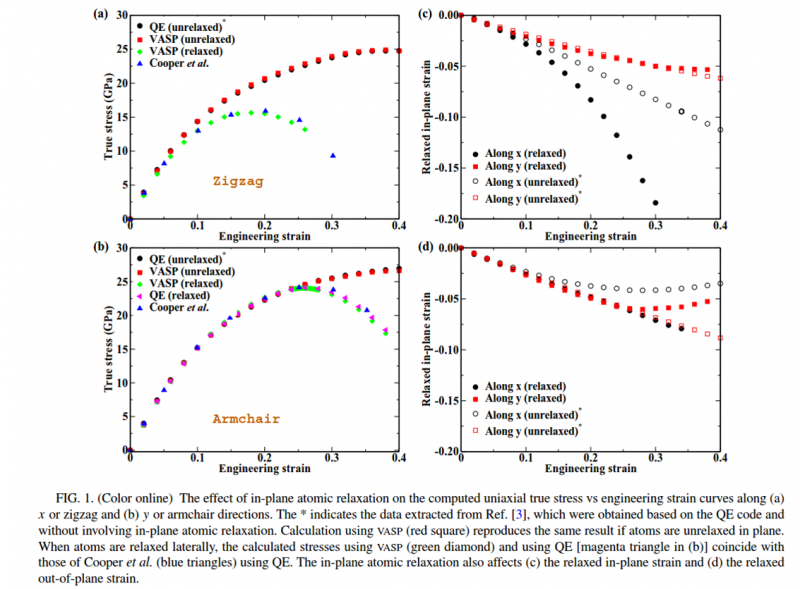 原始文章:Tianshu Li, Ideal strength and phonon instability in single-layer MoS, Phys. Rev. B 85, 235407 – Published 4 June 2012, http://journals.aps.org/prb/abstract/10.1103/PhysRevB.85.235407 comment: Ryan C. Cooper, Jeffrey W. Kysar, and Chris A. Marianetti, Comment on “Ideal strength and phonon instability in single-layer ” Phys. Rev. B 90, 167401 (2014) (T. Li的文章里的计算结果有些与R. C. Cooper等人的结果有很大差别,特别是MoS2在比较大的应变时力的应力计算数据,R. C. Cooper等人怀疑T. Li的文章里MoS2计算结果是不适宜的步骤所导致) Reply: Tianshu Li, Reply to “Comment on ‘Ideal strength and phonon instability in single-layer ’ ” Phys. Rev. B 90, 167402 (2014) (T. Li的回复指出差别的原因: 在于他自己文章里,计算MoS2在应变下的应力没有考虑原子位置进行的in-plane relaxation)。 In conclusion, we identify the in-plane atomic relaxation as the root for the discrepancy between our previous paper and Cooper et al. on the reported uniaxial stress-strain curves along the zigzag and armchair directions of single layer MoS2. 计算应变下的应力,需要进行原子位置弛豫,不做原子位置的弛豫得到的结果在讨论材料的失效就没有多大的说服力了。 附件里的PDF文件合并了所有相关的文章。 |