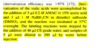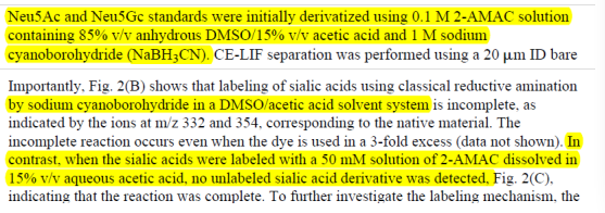 目前,我的实验室采用DMSO/乙酸溶解(终浓度0.2M),标记反应(3ul 2-AMAC+3ul NaBH3CN)结束后,加44ul超纯水至50ul终止反应。但是加水以后,溶液会出现黄色沉淀,看着像2-AMAC析出。加水终止反应参考文献如下:图3