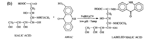 我主要利用2-Aminoacridone(2-AMAC,2氨基吖啶酮)来标记唾液酸(一种九碳糖),反应式如下:图1