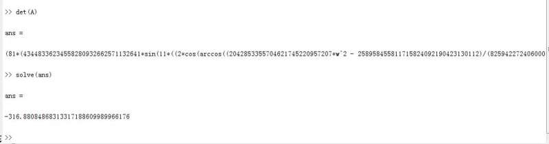 用matlab求解一个行列式,行列式中每一项是关于w的一个式子,行列式得到后,用solve只能得到一个数值解,但是理论上是应该有无穷多的解的,式子很长,都不能全部显示出来,这个能不能用ezplot把图画出来的啊?求教各位大神。下面是得到的式子和一个解。我的期望和理论都应该是一系列解,即超越方程的一系列根。 捕获.JPG |