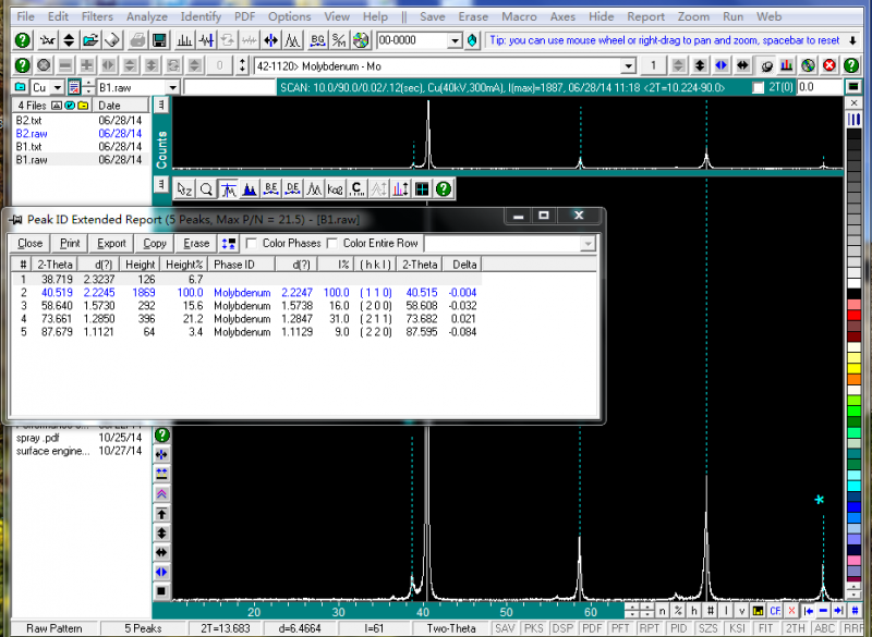 小弟最近做了个纯钼涂层的XRD分析,为何主峰边有一峰,单峰检索出现的不是氧化物,也不是杂质啥的,这是肿么回事??大神在哪里?给分析分析。。。
