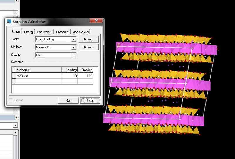 我构建了蒙脱石的结构模型,使用运用Sorption板向蒙脱石的双晶胞结构体系中添加水分子,形成一、二、三层水分子,水分子分层也不是很明显,然后用Discover模块进行能量优化,计算出最低能量构型,出现错误,不知道哪一步错了。一直做不出来来。 二层 一层 三层 能量最小化出现错误.jpg |