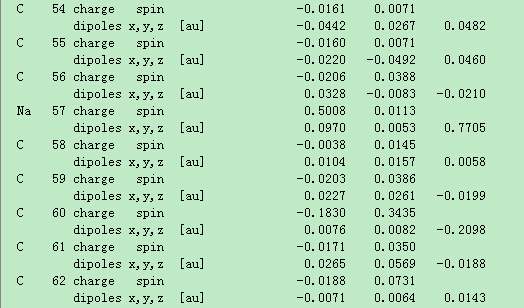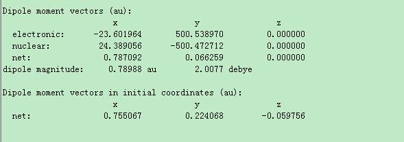 您好!还有几个问题想请教下: 1.dipole magnitude应该就是net的三个分量的模量。这句话该怎么理解。dipole magnitude后面只有两个数据,而且一个单位是a.u. 另一个单位是debye。这个dipole magnitude后面的两个数据是否应该理解为同一个物理量的不同单位表示。 2. 倒数第二行出现的原始坐标,这个原始坐标指的什么坐标,(我的模型是建立在XYZ坐标下的,用的是 Dmol 软件包) 3.图1出现两个net,并且对应的XYZ方向上的大小不一样。这两个net有什么区别呢,应该以哪一个作为参考呢 4. 对于最后一行Z方向上的偶极矩0.059...,这个大小一般来说对物体的某些性质是需要吧这个偶极矩的影响考虑进去呢,还是说这个偶极矩的大小可以忽略。 |