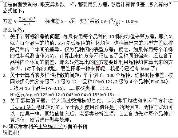 第一,关于如何操作数据分析: 1. 所谓总体平均值就是所有参试个体的总平均值(X),你先算每个品种的均值,再算所有品种间的均值,结果都是一样的; 2. 标准差(σ)就是先对品种进行方差分析,得到表型方差(V),开根号等到标准差σ; 3. 得到以上两个值后,计算每个品种的均值(xi); 4. 按照按照公式计算分级,统计每一级的品种个数; 5. 按照香农多样性指数计算多样性; PS:以上所有步骤都可在EXCEL里进行! 第二,关于聚类: 另关于聚类的问题,原则上用任何一种方法均可(但你用了哪一种方法得到的聚类图最好在下面注明),因为这些计算品种间距离(差异)的几种方法都是大家公认的,当然你也可以参考类似文献采用的得较多的一种方法! 祝顺利! |