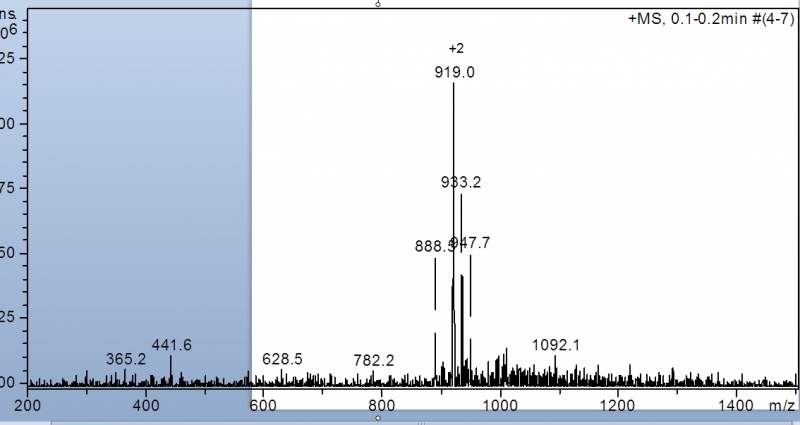M/2好像是850多吧?你在chemdraw上套一下,看看是不是产生了碎片?