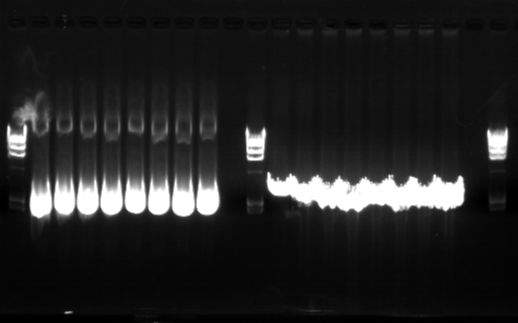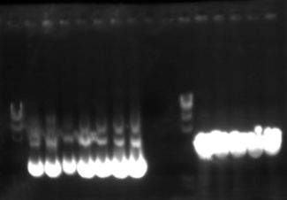 图左边第一条是HindIII的Maker,我提的质粒大小为15kb左右,应该在Maker的第一和第二条带之间,而且目的质粒是单拷贝的应该很暗。但是先后2次跑胶怎么都是那么小那么亮,估计不是我需要的条带,右半部分是BamHI酶切对应质粒产物,应该是一条15kb的条带,由此可看也不对。质粒分别是从DH5a和DH10B提取出来的。