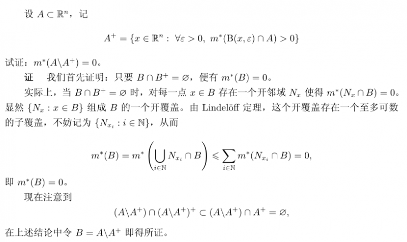 提供一个思路. 不妨设A是R^n中的可测集并且测度大于零. 然后让 http://en.wikipedia.org/wiki/Lebesgue_point 现在根据可积函数(almost everywhere) 几乎所有的点都是Lebesgue 点, 特别地, 几乎所有A中的点也是f(x)的Lebesque点. 下面简要说明A中的Lebesgue点一定是正测度聚点. 否则, 存在x的某个领域N(x),使得 如果A 是不可测集, 我就不知道怎么证明了. |
