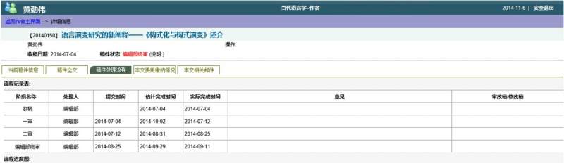 我投了一篇稿子《当代语言学》,进入编辑部终审,可是后来就没下落了。现在的状态(见图)