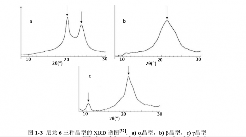 图为尼龙6的三种晶型的XRD谱图,但PA6主要存在γ和α晶型,β晶型是中间态,不稳定,易发生相转化。