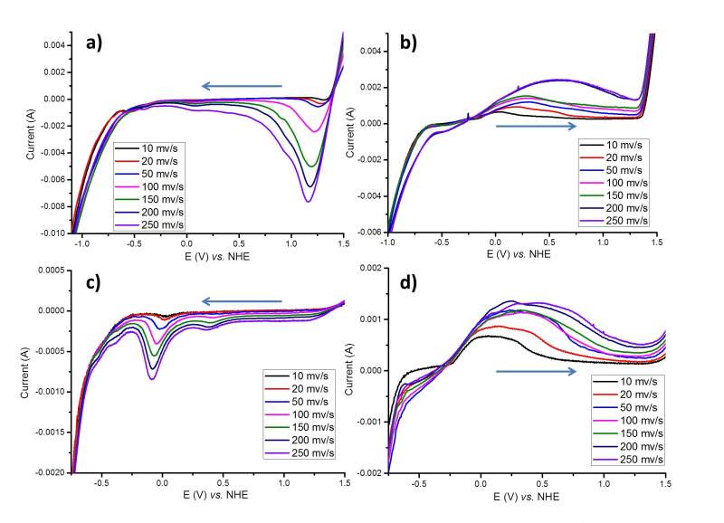 图片说明:a,b是以NaCl为电解液,箭头代表扫描方向;c,d是以Na2SO4 (0.5 M)为电解液作对比的
