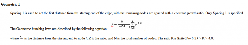 ICEM帮助是不是有错误啊?求大神鉴定 Geometric 1 Spacing 1 用于设置第一个节点与边的起点间的距离。剩下的节点利用相同的增长率进 行分布。只需要指定 Spacing1 与 Ratio1。 该分布律利用以下方程进行节点间距计算: 式中 Si 为从 edge 的起点到节点 i 的距离。R 为比率,N 为总节点数,比率的限制为 0.25>R>4。 123.PNG |