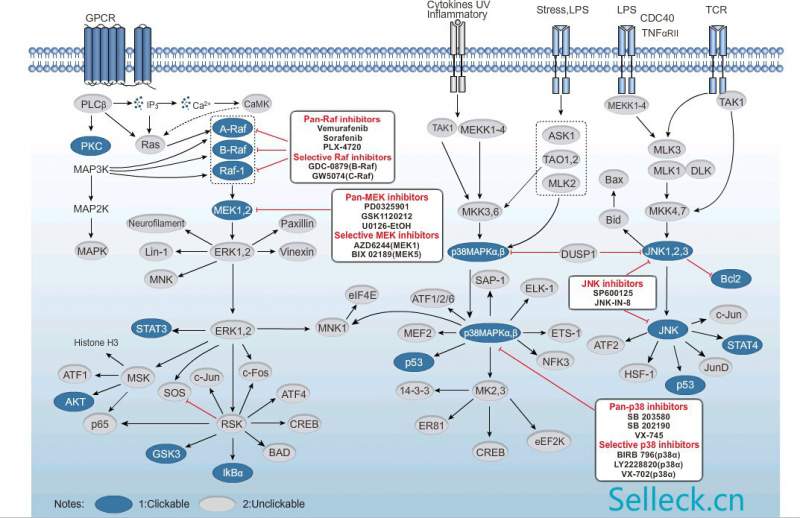 一、 关于B-raf基因 BRAF是人类最重要的原癌基因之一, 大约8%的人类肿瘤发生BRAF突变。BRAF绝大部分突变形 式为BRAFV600E突变, 主要发生于黑色素瘤、结肠癌和甲状腺癌中。该突变导致下游MEK-ERK信号通路持续激活, 对肿瘤的生长增殖和侵袭转移至关重要, 是抗黑色素瘤等V600E突变肿瘤的有效作用靶标之一。2011年, 首个BRAFV600E靶向抑制剂威罗菲尼被FDA批准上市, 用于治疗BRAFV600E突变的晚期黑色素瘤患者, 有效延长了患者无进展生存期及总生存期, 取得了突破性的治疗效果, 也是典型的基于基因诊断选择用药的靶向治疗药物。但是耐药性的出现使得药物治疗效果受到限制, 其耐药机制、新药物开发以及预防或延缓耐药的研究成为目前需要解决的关键问题。 二、 信号通路图 三、 抑制剂Dabrafenib 药物描述: Dabrafenib (GSK2118436)是一种突变型BRAFV600特异性抑制剂,IC50为0.8 nM,作用于B-Raf(wt)和c-Raf效果低4和6倍。 体外研究: Dabrafenib对b-Raf激酶具有选择性,对B-Raf的活性比其它测试过的91%的激酶高400倍。 Dabrafenib抑制B-RafV600E激酶,导致ERK磷酸化降低和抑制细胞的增值,在特异性编码突变的B-RafV600E的癌细胞中细胞停滞在G1期。 体内研究: Dabrafenib(口服)抑制B-RafV600E突变的黑色素瘤(A375P)的生长,在免疫受损小鼠中皮下注射结肠癌(Colo205),Dabrafenib(口服)同样能抑制肿瘤生长。 |