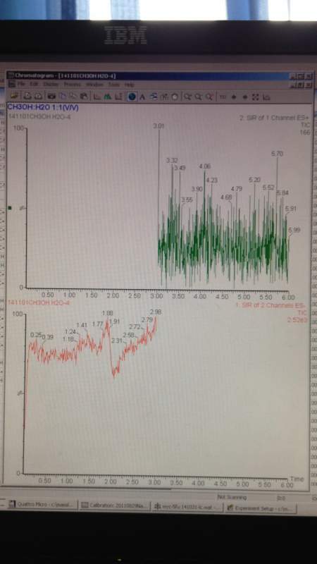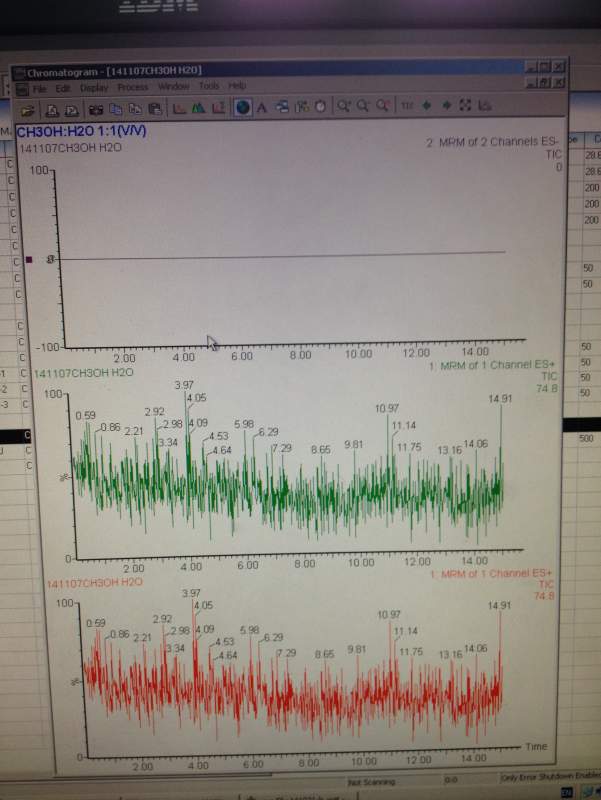 液相为waters 2695,质谱为三重四级杆,采用MRM模式,有两个通道分别采用ES+和ES-,空白样品(甲醇:水=1:1,V/V)走样后,ES+通道基线正常如下图,ES-通道走样为0,不理解,求大神们解释。
