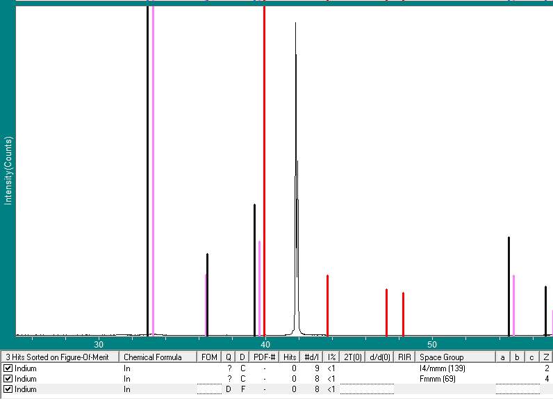 | 本人用蓝宝石为衬底,生长的金属铟薄膜。以下是xrd的图数据。我对峰的时候,怎么也对不出来衬底蓝宝石的峰,想知道对应的卡片是哪个编号,哪个取向?还有就是金属铟的峰和衬底峰相比,衬底峰显得很弱,基本看不出来。求高人再给对出金属铟的峰,卡片编号。 |