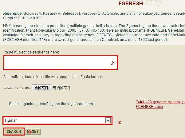 打开页面后,如下图,①框中贴入序列,②框中选择相应物种,如没有你的物种则选择近缘物种,点击③框中submit,结果就是对该基因内相关结构的预测分析,一看就明白。