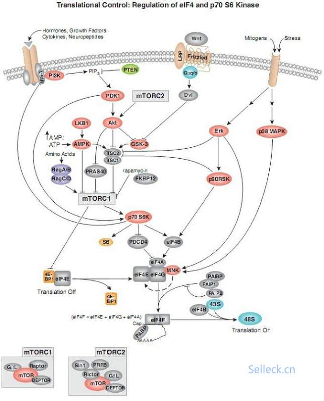 一、 关于eIF4E基因 eIF4E(eukaryotic translation initiation factor 4E),真核细胞翻译起始因子,是真核细胞翻译起始和调控的核心成分,通过与mRNA 5’端帽子结构结合,在蛋白质翻译起始过程中发挥重要作用。研究证实在动物和人体中包括肺癌在内的大多恶性肿瘤中存在过表达,它与多种恶性肿瘤的发生、浸润和转移密切相关。 eIF4E在肿瘤的整个演进过程中 起重要作用。一方面eIF4E过表达改变了细胞形态,增强细胞增殖能力,并诱导细胞转化、肿瘤生成和转移 ; 另一方面eIF4E通过多方面调控恶性肿瘤相关mRNAs的翻译,包含细胞有丝分裂过程、激活原癌基因、血管形成、增强自分泌、细胞存活、侵袭及与细胞外环境的交通。 二、 信号通路图 三、 抑制剂4EGI-1 简介:4EGI-1 is a competitive eIF4E/eIF4G interaction inhibitor by binding to eIF4E with KD of 25 μM. 体外活性:4EGI-1扰乱eIF4F 复合体,在体外实验中抑制Cap 介导的翻译。4EGI-1在Jurkat细胞中有促凋亡活性,在A549肺癌细胞中,能够有效抑制细胞生长,其IC50值约为6μM。在人类肺癌细胞中,4EGI-1通过诱导DR5和下调c-FLIP,cap依赖性蛋白质翻译的单独抑制而增加TRAIL诱导的细胞凋亡。此外,在慢性淋巴细胞癌中,4EGI-1通过 cap依赖和非依赖的机制来恢复对ABT-737的敏感性。 |
