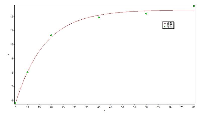 你拟合用的数据: 5 5.840052778 10 8.011533011 20 10.65614361 40 11.92265715 60 12.19713629 80 12.74006744 拟合出方程之后,你MATLAB画散点用的数据: x=[1,5,10,20,40,60]; y=[5.840052778,8.011533011,10.65614361,11.92265715,12.19713629,12.74006744]; 两个数据都不一致,图如何能对呢? 1stopt拟合结果没有任何问题。 |
