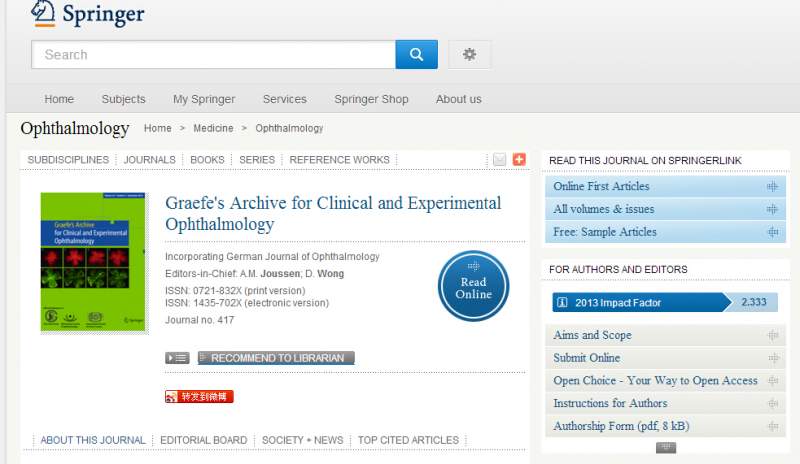 不知是电脑问题还是浏览器问题,"Graefes Arch Clin Exp Ophthalmol"杂志的"instruction for author"打不开,看不到里面的具体投稿要求,本人想投稿,很急,麻烦哪位好心的高人将这个杂志的"instruction for author"每一部分中的详细信息都复制下来,最后放在一个word文档中,不胜感激! 20141112.jpg |