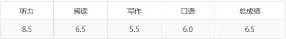 ÌýÁ¦8.5 ÔĶÁ6.5 д×÷5.5 ¿ÚÓï6 ×ܳɼ¨ 6.5£¬Ñ§Ð£ÒªÇóµ¥Ïî¹ý6£¬¾ù·Ö¹ý6.5£¬¾Í²î×÷ÎÄÕâ0.5°¡