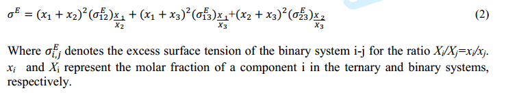 X1/X2 应是下标,表示(X1,X2)二组元液体。\left(\sigma_{ij}\right)_{X_1/X_2}应该是在二组元液体(X1,X2)下的表面excess张力应力。应该不能忽略下标的。最后的表达是三组元的excess surface tension? 用二元的表 ...