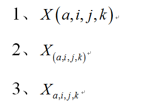 如果一个变量同时需要多个下标,例如一个四维数组的元素X(a,i,j,k),在论文写作时一般怎么表示呢?楼主表示只能想到如下图所示的几种方式,但不知道哪个对哪个错,求指点~~
