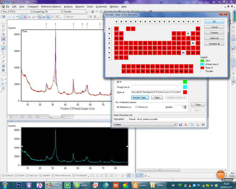 分析按步骤大致如下: 打开文件-----搜索样品峰的位置-----分析物相(首先找到物质中可能元素种类,确定后,点击ok,其次,搜索可能的晶相,最后核实晶相),如图所示。 楼主可以参考如下帖子:http://muchong.com/html/201112/3999079.html 打开文件.png 搜索峰.png 分析具体峰位置.png 找到物质中可能含有的元素.png 搜索晶相.png 搜索的晶相.png |