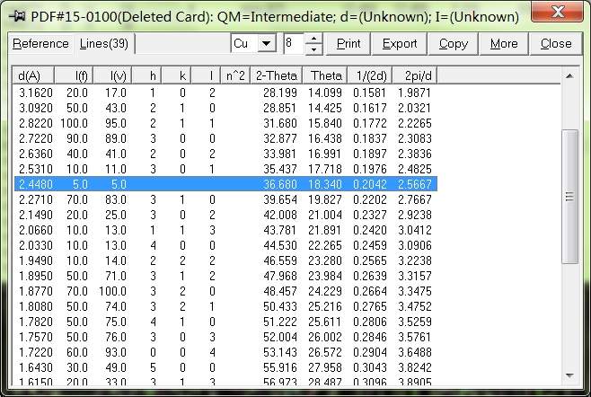 d值为2.448的地方为什么没有hkl值? 如果是我的pdf卡片库的问题,有没有大神能够提供一份正常的这个卡片的数据? 还是说PDF卡片库里经常会有这种某个晶面值不详的情况? 搜狗截图14年11月16日1751_1.jpg |