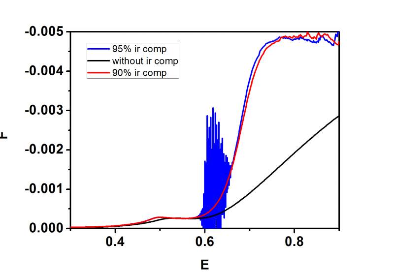 小弟刚开始做水的电氧化相关工作,参阅文献发现测试过程中需要做所谓的iR compensation。相关的原理介绍等看了一些,但是实际操作中没有经验,不大明白具体的设置。使用的电化学工作站是CHI760D,在设置参数时全部使用的是默认值(除了补偿等级)。想请问各位老鸟,这么设置有没有问题: 实验条件为静止电极,0.1M KOH,材料是Co3O4,对电极SCE,95%补偿等级下中间段出现震荡 设置: |