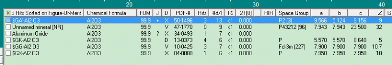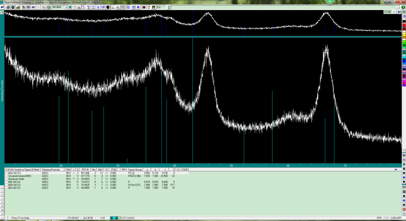 大家好,我才开始接触XRD分析,和pdf标准卡进行物相检索,但是结果找到的几个物质FOM值均为99.9,原因是什么呢?该如何进行匹配呢?XRD测试结果上传为附件11-3.asc。应该是gama氧化铝。大神们给指导指导吧 物相检索结果.png |