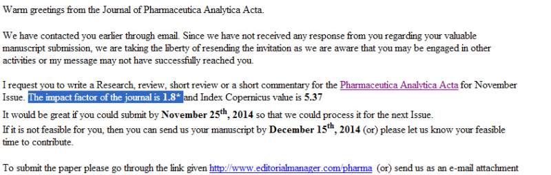 前两天收到一杂志约稿,Pharmaceutica Analytica Acta,邮件中写明IF为1.8,但是查询了最新的SCI收录,没有找到这个杂志,请问虫虫们这到底是不是真的呀? Pharmaceutica Analytica Acta 截图.jpg |