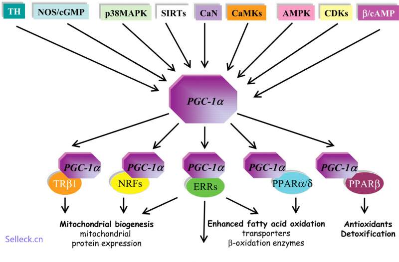 一、 PGC-1α简介 过氧化物酶体增殖物激活受体γ辅激活因子1α(peroxlsome proliferator—activated receptor-γ coactlvator—1α,PGC—1α),是近几年来发现的一种核转录辅激活因子,因其能与过氧化物酶增殖激活受体γ相互作用而得名。PGC—1基因家族包括3个成员:PGC—1α、PGC—1β和PGC—1相关协同刺激因子。 PGC—1α能与转录因子或其它辅激活因子相互作用通过不同机制增加靶基因转录效率,从而在机体的适应性产热、线粒体生物合成、肝糖原异生及脂肪酸β氧化等一系列能量代谢过程中发挥作用,且PGC-1α的表达和活性异常与代谢型疾病之间存在紧密关联。 二、 研究领域 三、 激活剂ZLN005 体外活性研究:在L6肌管, ZLN005增加该PGC - 1α基因与下游基因通过激活AMP活化蛋白激酶的表达,并提高对葡萄糖的摄取和脂肪酸氧化,无明显的细胞毒性。而ZLN005不具有在大鼠原代肝细胞,这表明细胞类型特异性相同的效果。 体内活性研究:胰岛素耐量试验结果显示:与ZLN005治疗显著在db / db小鼠降低胰岛素抵抗,就证明了减少的AUC的约18%。一键通也于db / db小鼠进行的, ZLN005提高丙酮酸宽容,就证明了减少AUC的16 % 。在db / db小鼠上使用ZLN005处理,血浆游离脂肪酸和甘油三酯的含量分别为20%和37% ,分别降低和胆固醇降低了10%。血浆胰岛素和β羟基丁酸酯含量,肝脏/体重指数和脂肪的组合物,以及肌肉和肝甘油三酯水平的,但是,使用ZLN005处理过后并没有改善二甲双胍。 |