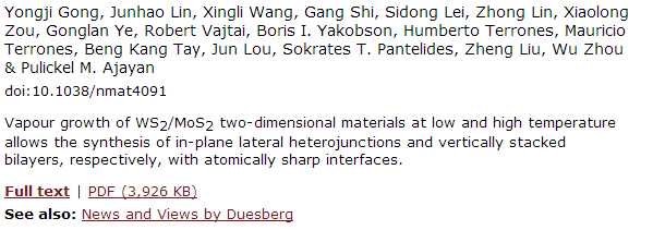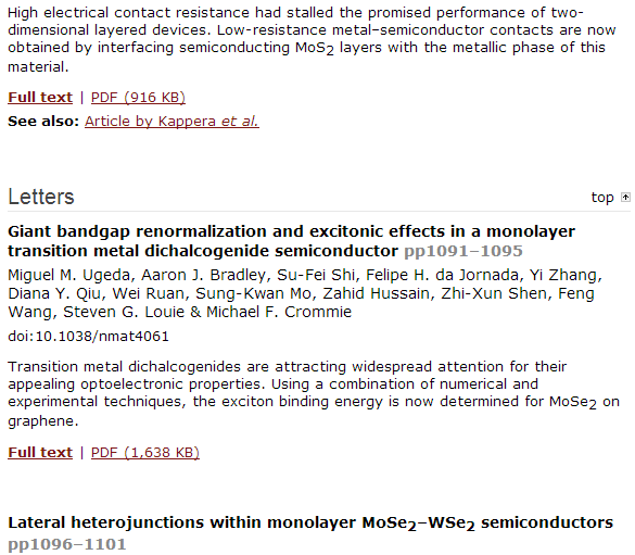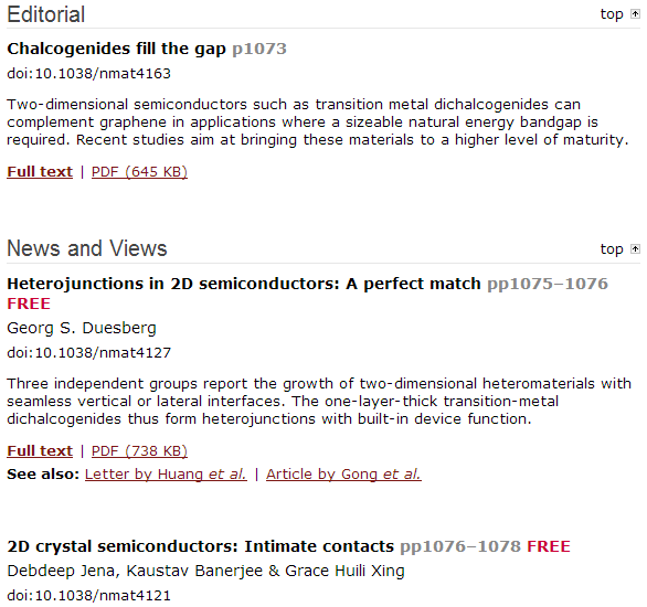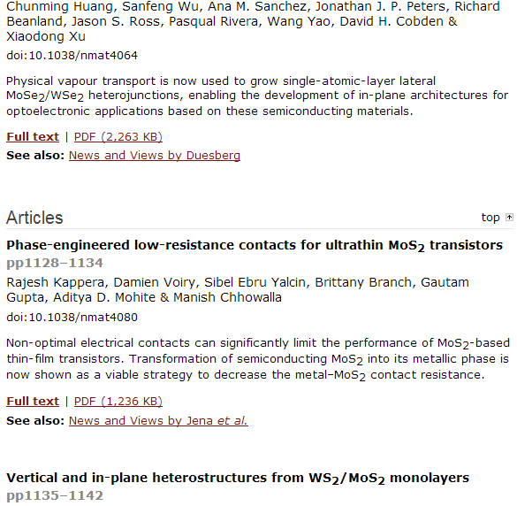 2014年11月 顶尖材料期刊《Nature Materials》 Focus Issue 二维半导体