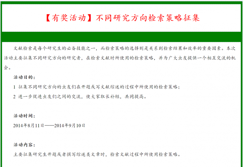 的活动贴,感觉其中的回复对于大家来说,尤其是很多刚上研究生的或者依然不会综合查询文献的童鞋,很有帮助。